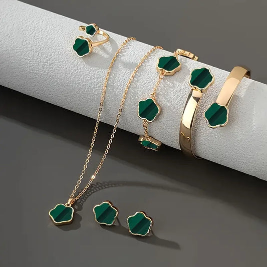 5pcs Classic Lucky Flower Women's Necklace + Earrings + Ring + Bracelet Set